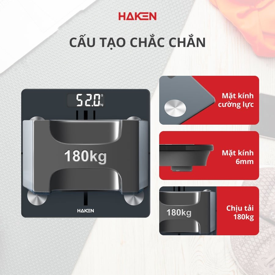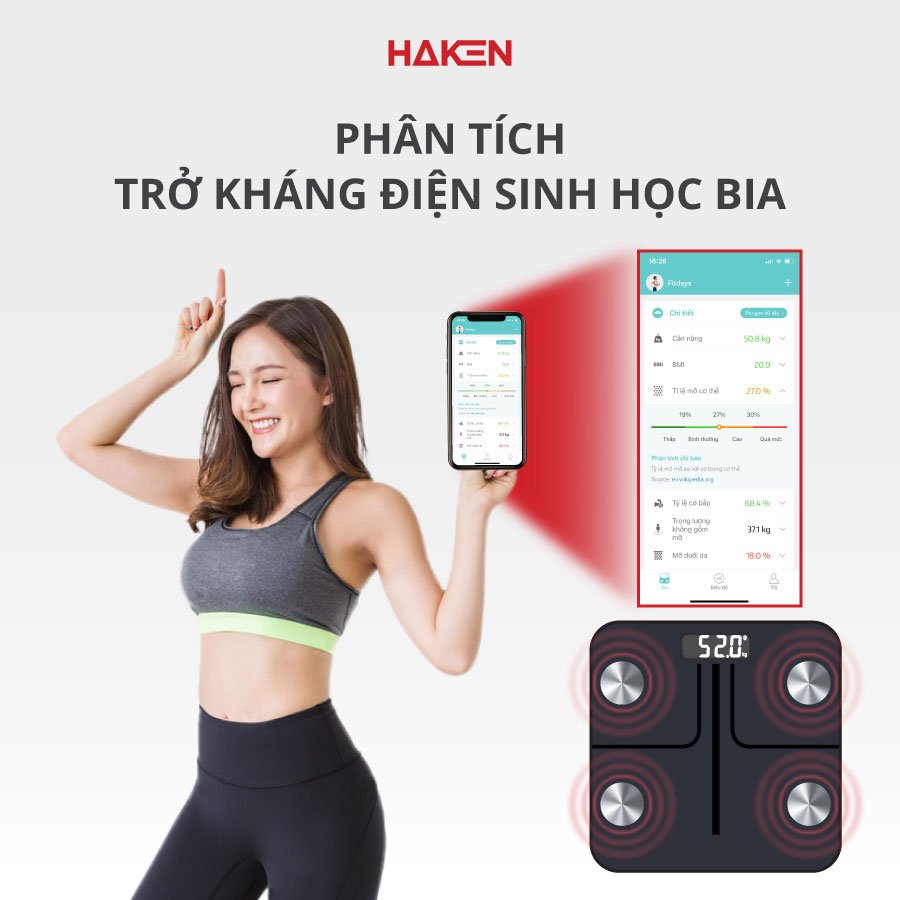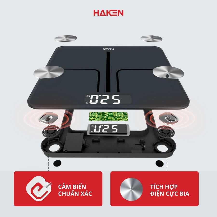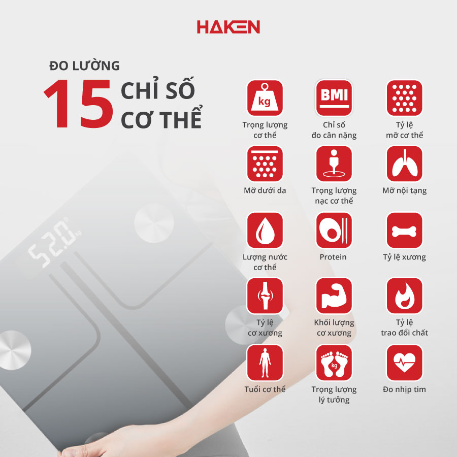 Cân đo sức khỏe thông minh HAKEN sử dụng phương pháp phân tích trở kháng sinh học BIA - Phương pháp đo lường sức khỏe tân tiến và chính xác nhất thể giới, đo được 15 chỉ số sức khỏe: nhịp tim, cân nặng, BMI, tỷ lệ mỡ cơ thể, mỡ nội tạng, mỡ dưới da, tỷ lệ cơ bắp, trọng lượng không bao gồm xương, nước cơ thể, cơ xương, khối lượng xương, đạm, BMR, độ tuổi cơ thể.........Cung cấp cho bạn một nguồn dữ liệu chính xác, giúp bạn hiểu rõ về cơ thể của mình